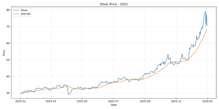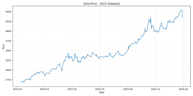 The gold chart shows a steady, persistent uptrend across 2025 with a notable acceleration in early fall. Prices begin around $2,700/oz and climb gradually through mid-year. A step change higher occurs around September & October, lifting the level into the $4,000+ zone. The year ends near the highs around $4,400/oz, consistent with a strong precious metals rally.