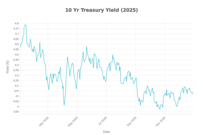 The 10-year Treasury yield chart shows a choppy year, with a mid-year rise and a rebound into year-end. Yields begin around the mid 4% range, decline into spring, and then climb again into early mid-summer. A sharp drop occurs around early fall, after which yields stabilize and partially recover. The year ends around the low 4% range, below the early year highs.