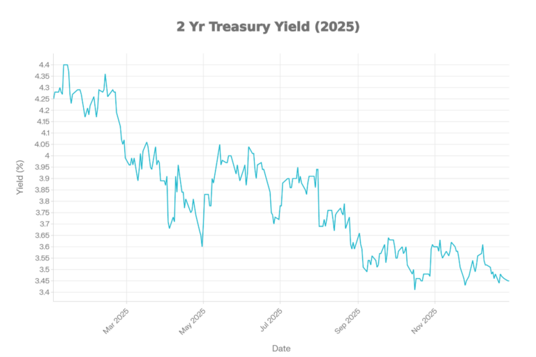 The 2-year Treasury yield chart shows a clear downtrend over 2025, with the highest levels early in the year and the lowest levels late in the year. Yields start in the low 4% range and decline in waves through spring and summer. The lowest area appears in the fall around the mid-3% range, followed by only a modest rebound. The year ends near the lows, consistent with markets pricing easing and/or softer growth expectations.