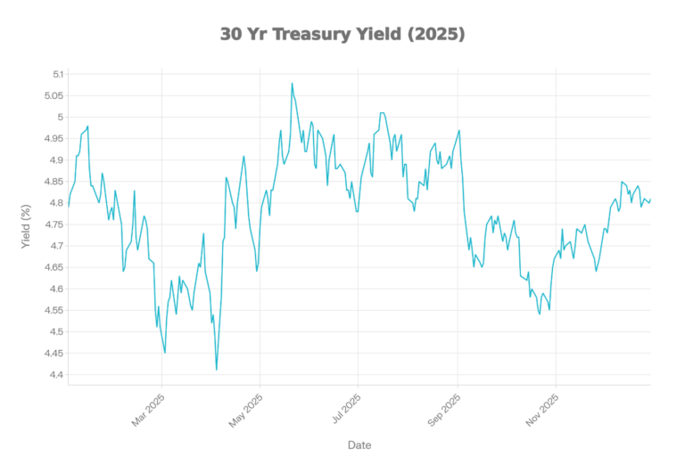 The 30-year Treasury yield chart is volatile but broadly range-bound, with a spring low, a late spring early summer high, and a lower late-year zone. Yields dip into the mid 4% area in spring, then spike above 5% around late spring early summer. After mid year, yields trend down into the mid to upper 4% range before stabilizing. The chart ends around the upper 4%, below the year’s peak.