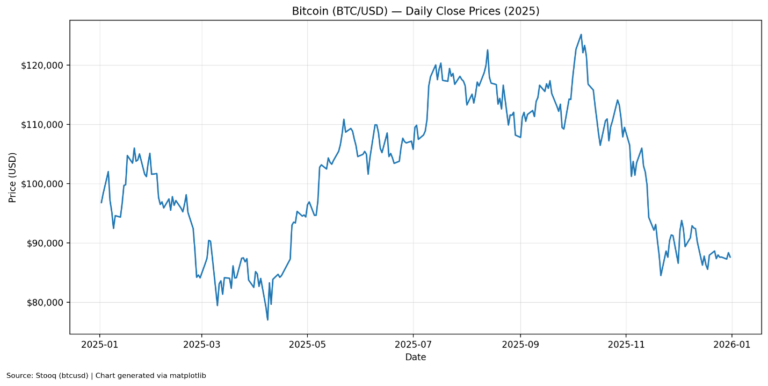 The Bitcoin chart shows a volatile year with a spring drawdown, a powerful summer rally, and a sharp selloff into late 2025. Prices start around $90k, fall into the $70k/$80k range in March and April, and then surge above $110k by summer. The peak occurs in the fall around $125k, followed by a steep decline into November. The year ends closer to $88k, well below the peak but above the spring lows.