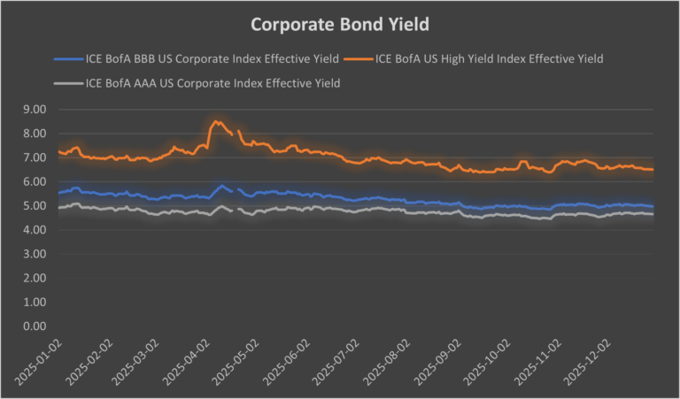 The corporate bond yield chart compares multiple credit tiers and shows yields generally drifting lower into year-end, with lower-quality credit remaining more volatile. Higher-grade corporate yields (AAA/BBB) move within a tighter band, while high yield swings more sharply. All series peak earlier in the year and finish below their highs, signaling easing financing conditions versus peak stress points. The persistent spread between investment-grade and high yield bonds highlights that credit risk remained priced throughout the year, even as yields declined.