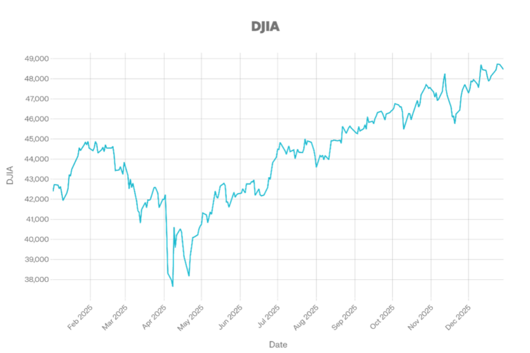 The DJIA chart shows early weakness, a spring low, and a sustained rally into year end. It starts around 43k, drops to roughly 38k in April, then rebounds. From summer through December, the DJIA trends higher, though volatility is exceptionally high in the fall. The index finishes near 49k, close to the chart’s highs.
