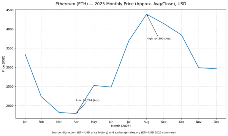 The Ethereum chart shows a sharp decline in the first half, a strong summer breakout, and then a decline lasting several months into the end of 2025. ETH begins around $3,300, bottoms near $1,800 in April, and then rebounds sharply. The high is around $4,390 in August, then trends down through the fall. By December, ETH settles near $3,000, above the lows but far below the summer peak.