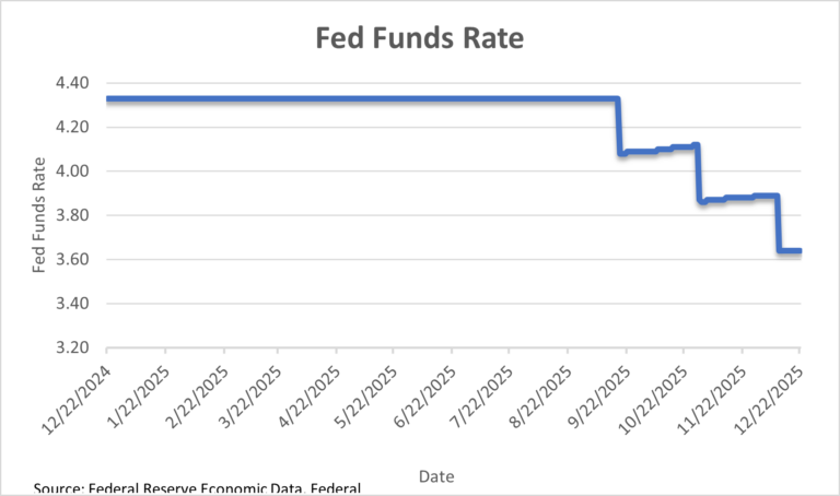 The Fed Funds chart shows a flat policy rate early in the year, followed by step declines later in 2025. Rates begin around the low to mid 4% range and remain steady for much of the timeline. The meaningful move occurs in late Q3/Q4, when the rate drops toward the mid 3% area. The year ends with rate adjustments that are consistent with an easing cycle late in the year.