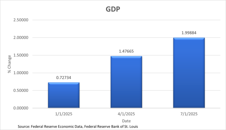 The GDP chart shows quarterly %change rising across the first three quarters of 2025. The data for the last quarter of 2025 has yet to be released. The series starts around 0.7% in Q1, increases to roughly 1.5% in Q2, and reaches about 2.0% by Q3. The trend is positive, indicating an acceleration in growth through mid-year.