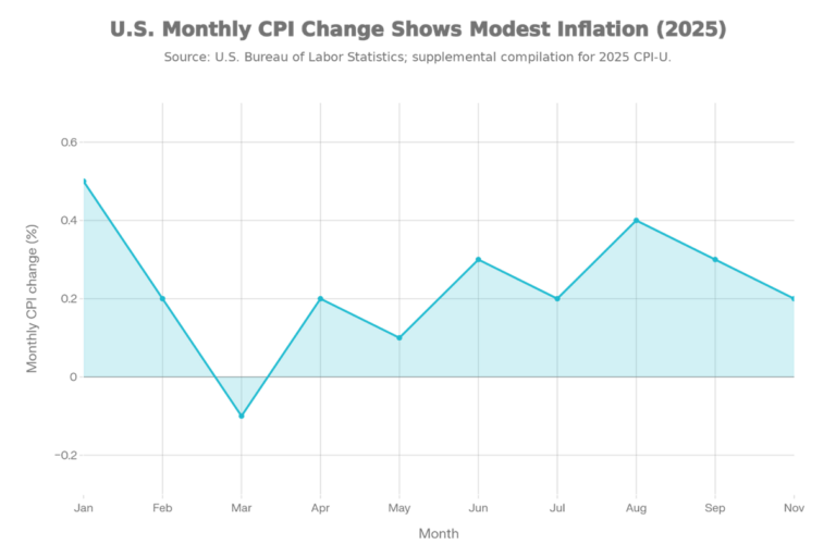 The inflation chart plots monthly CPI changes and shows generally modest inflation with one brief dip below zero. It starts strong in January (~0.5%), cools into March (around -0.1%), and then returns to positive prints through the middle of the year. Inflation firms again into late summer with a local high around August (~0.4%). By the last plotted month, the pace moderates back toward roughly 0.2%.