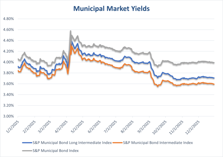 The municipal yield chart shows multiple muni indices moving together, with yields peaking earlier in the year and easing into year-end. The lines rise toward a spring/early-summer high and then trend lower afterward. By late 2025, yields are closer to their lows than their highs, indicating improving muni market conditions (from a yield perspective). Differences between the muni series are present but modest, with the overall direction dominated by broader rate moves.