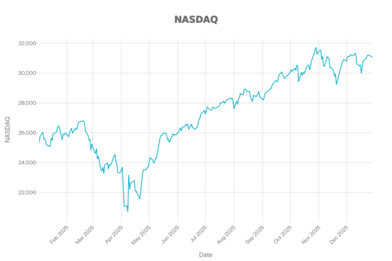 The NASDAQ chart shows the deepest spring drawdown among the major indices shown, followed by a robust recovery into late 2025. It begins around 26k, drops to roughly 21k in April, then climbs steadily. The uptrend accelerates into the fall, peaking near 31.5k around November. The year ends slightly below peak but still near 31k, reflecting strong overall performance after the spring selloff.