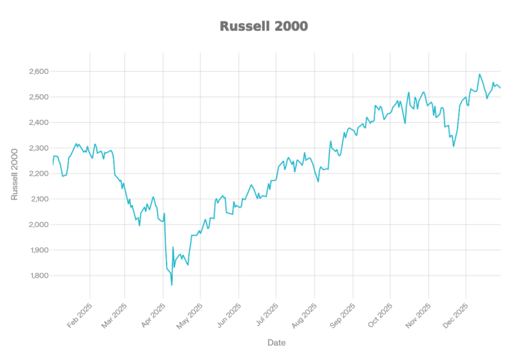 The Russell 2000 chart shows small caps under pressure early in the year, then recovering strongly in the second half. It starts near 2,250, bottoms around 1,775 in April, and then trends higher. The recovery is steady through summer and fall, with a brief pullback before resuming its upward trajectory. The chart ends around 2,550, near the top of the yearly range.