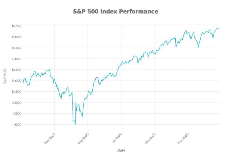 The S&P 500 chart shows a sharp drawdown early in 2025, followed by a strong recovery and new highs into year-end. The index begins near 13,000, falls to a low around 11,000 in the spring, and then reverses higher. From mid-year onward, the trend is steadily upward with only brief pullbacks. The year ends near the top of the range, around 16,400, signaling a strong back half.