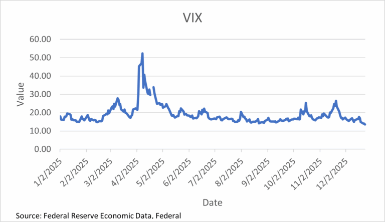 The VIX chart is dominated by a significant volatility spike in early April, followed by normalization. The index starts in the high teens, surges above 50 at the peak, and then falls rapidly back down. Through the rest of the year, VIX mostly stays in the teens with smaller spikes into the mid-20s in the fall. The chart ends near the low teens, indicating calmer conditions at year-end compared with the April shock.